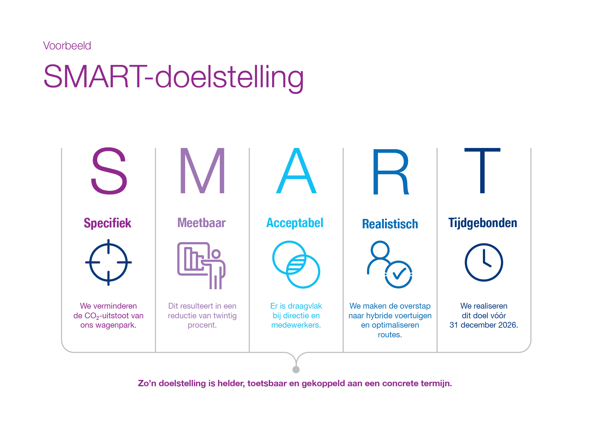 Voorbeeld: ''We verminderen de CO₂-uitstoot van ons wagenpark met twintig procent vóór eind 2026.''