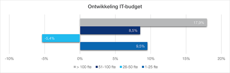 Gemiddeld lag het ICT-budget bij de deelnemende kantoren aan het IT-kostenonderzoek voor 2022 7,7% per kantoor hoger dan voor 2021. Deze toename wordt voornamelijk veroorzaakt door een stijging van 17,9% van de ICT-uitgaven bij de grote kantoren; bij hen is het budget significant verhoogd.