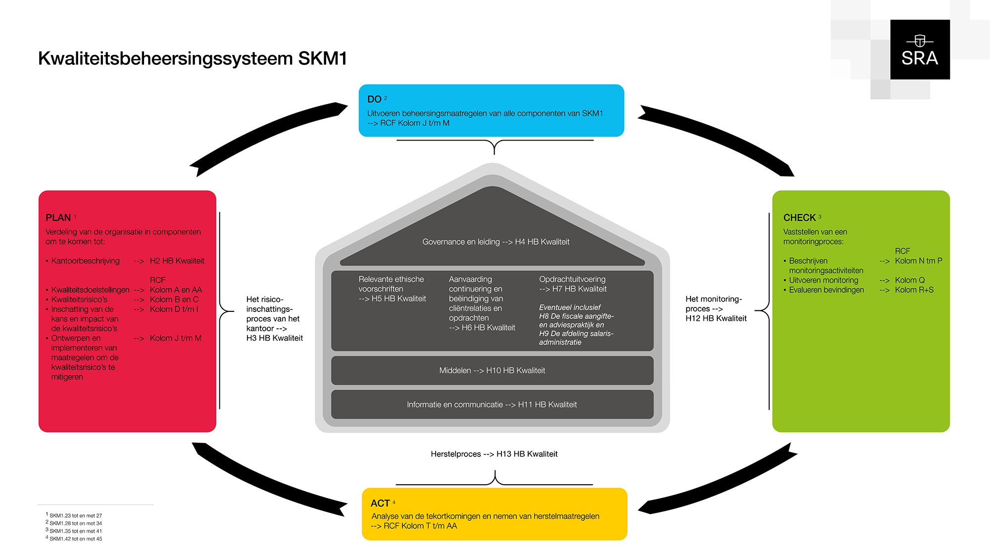 Hoe je deze risico's inschat en welke maatregelen je neemt, kan op basis van de Plan-Do-Check-Act-cyclus. Deze PDCA-cyclus is opgenomen in het SRA-Handboek Kwaliteit variant 1 SKM1.