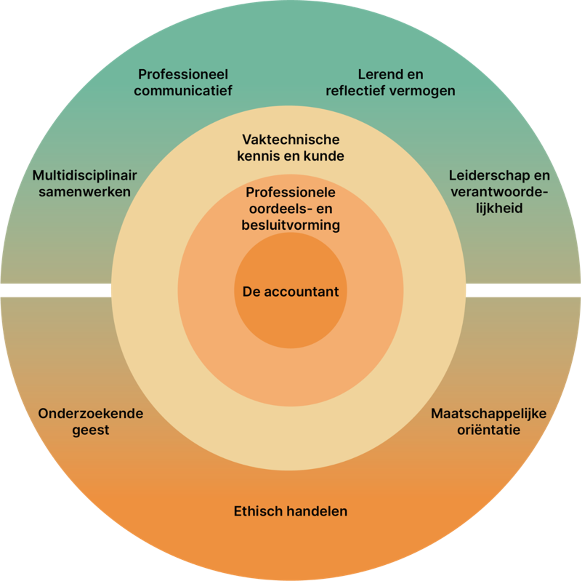 Samenhangend geheelDeze DNA-visual laat zien wat professioneel handelen van de accountant inhoudt. In het midden staat de accountant zelf. Daaromheen staan de competenties die samen richting geven aan het professioneel handelen.